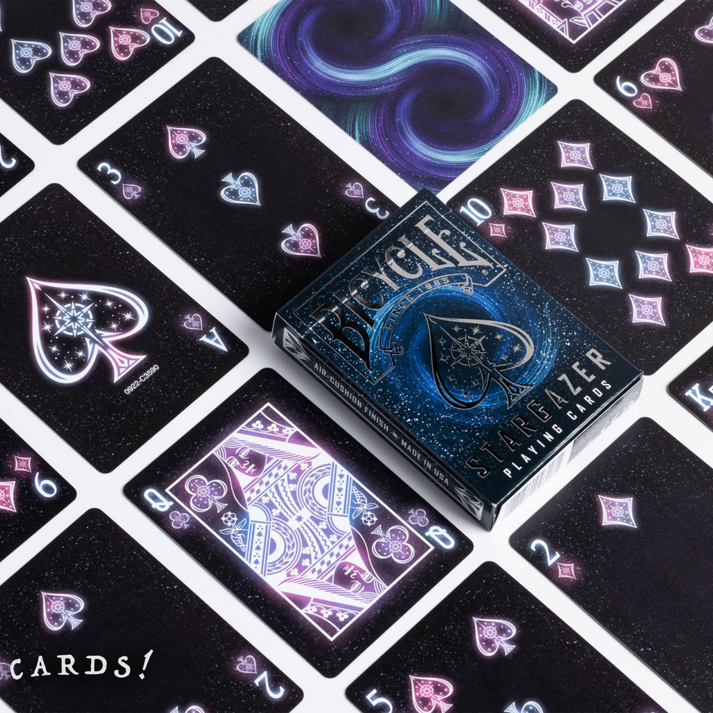 Get Lost in space with this beautifully Illustrated deck of cards. Bicycle playing cards stargazer features designs and colors inspired by one of the most mysterious and awesome objects in the Galaxy, the black hole. The tuck box brings the brilliance of the stars to life with the use of reflective silver foil. Great for any game, you will love playing with this deck hand after hand.