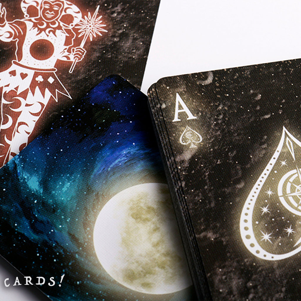 The courts and numbered cards are a bright white light that sit on a cratered back graphic. All the cards stay true to the original Starlight design. To add to the mystique and differentiate from the different pips we added a red glow to the hearts and diamonds.