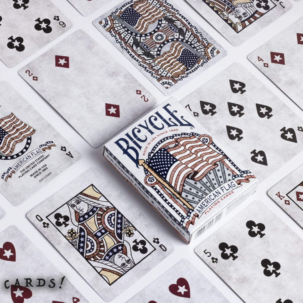 Bicycle 是一個標誌性的美國品牌,驕傲地在美國製造超過130年。Bicycle 撲克牌美國國旗系列慶祝我們的美國傳承與歷史。這些手繪插圖的牌卡以獨特的點數和人頭牌展現星條旗的圖案,並包含對品牌歷史牌背和盒子設計的致敬。